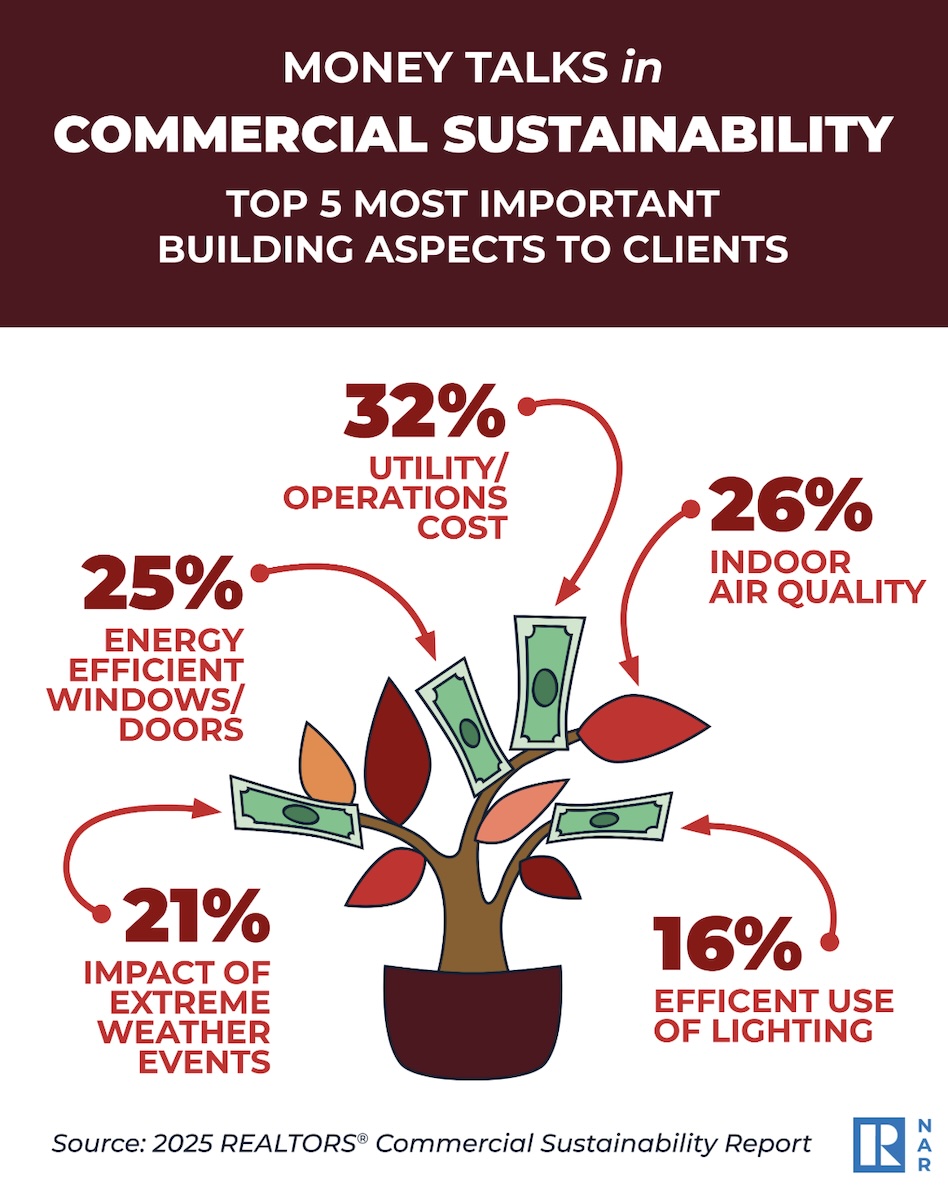 As sustainability plays a growing role in tenant expectations, operating costs, and asset value, NAR surveyed commercial REALTORS® nationwide in August 2025 to better understand how these factors are shaping decisions and deal-making in today’s CRE market and released their findings in December’s report.